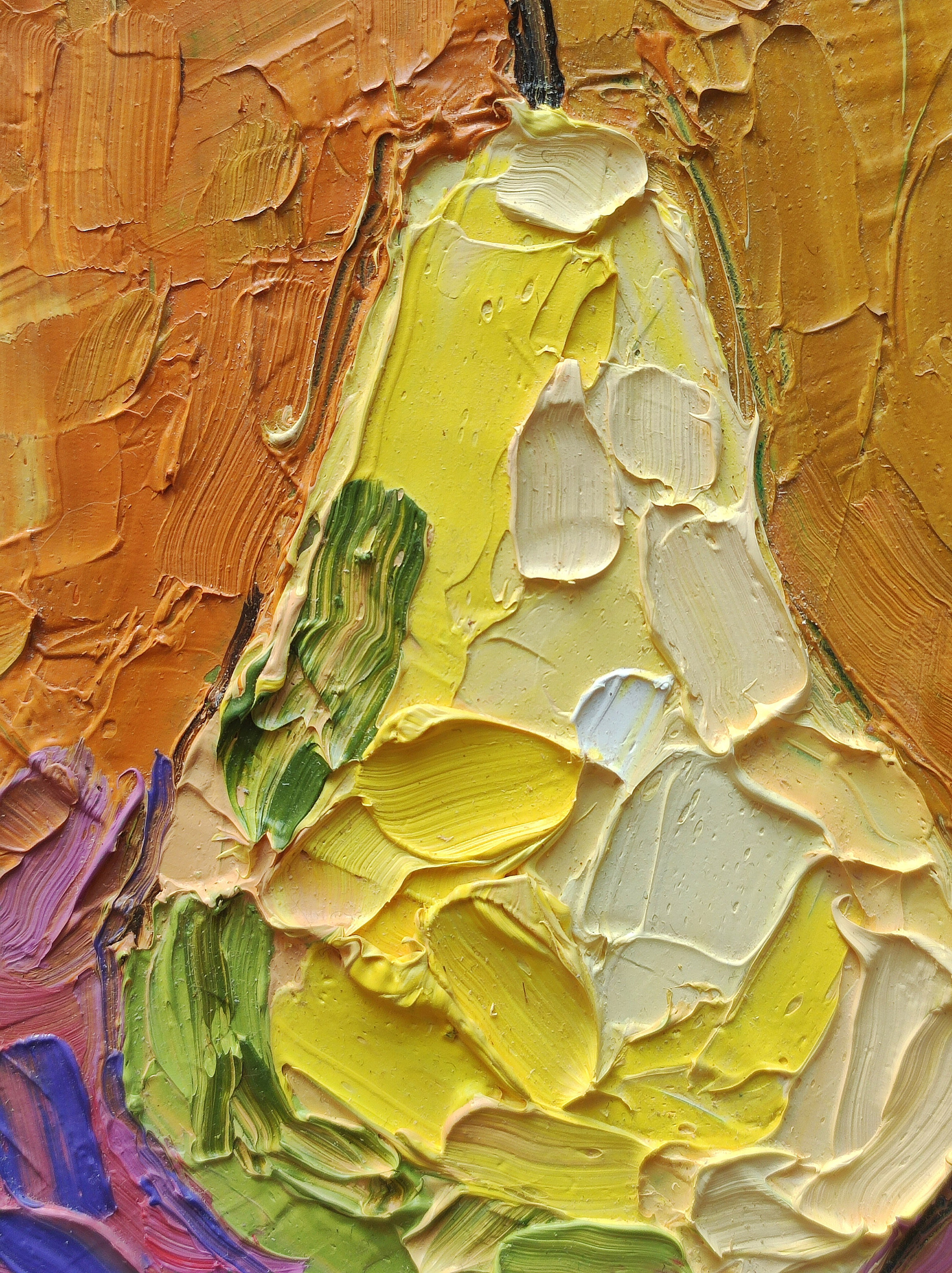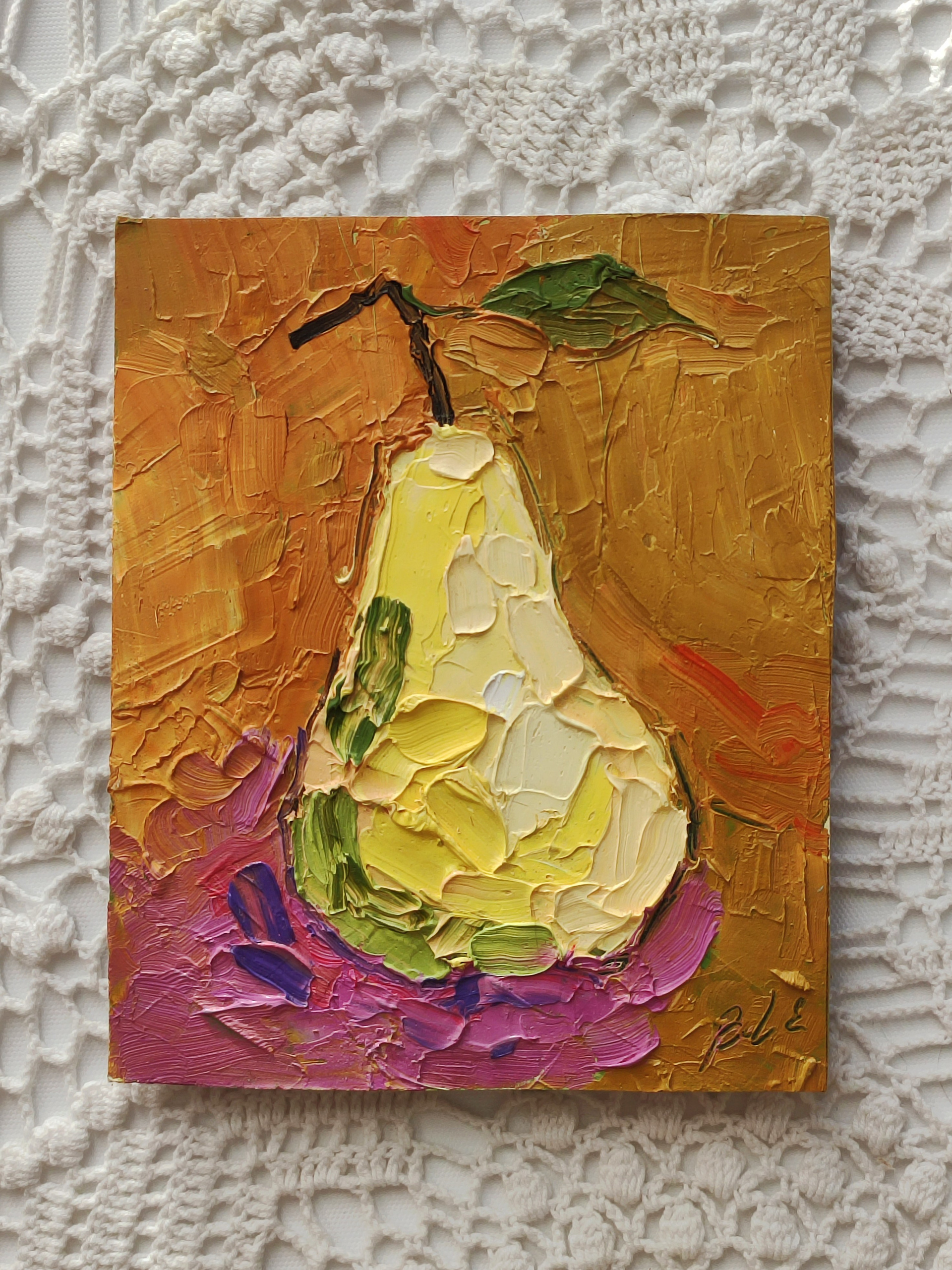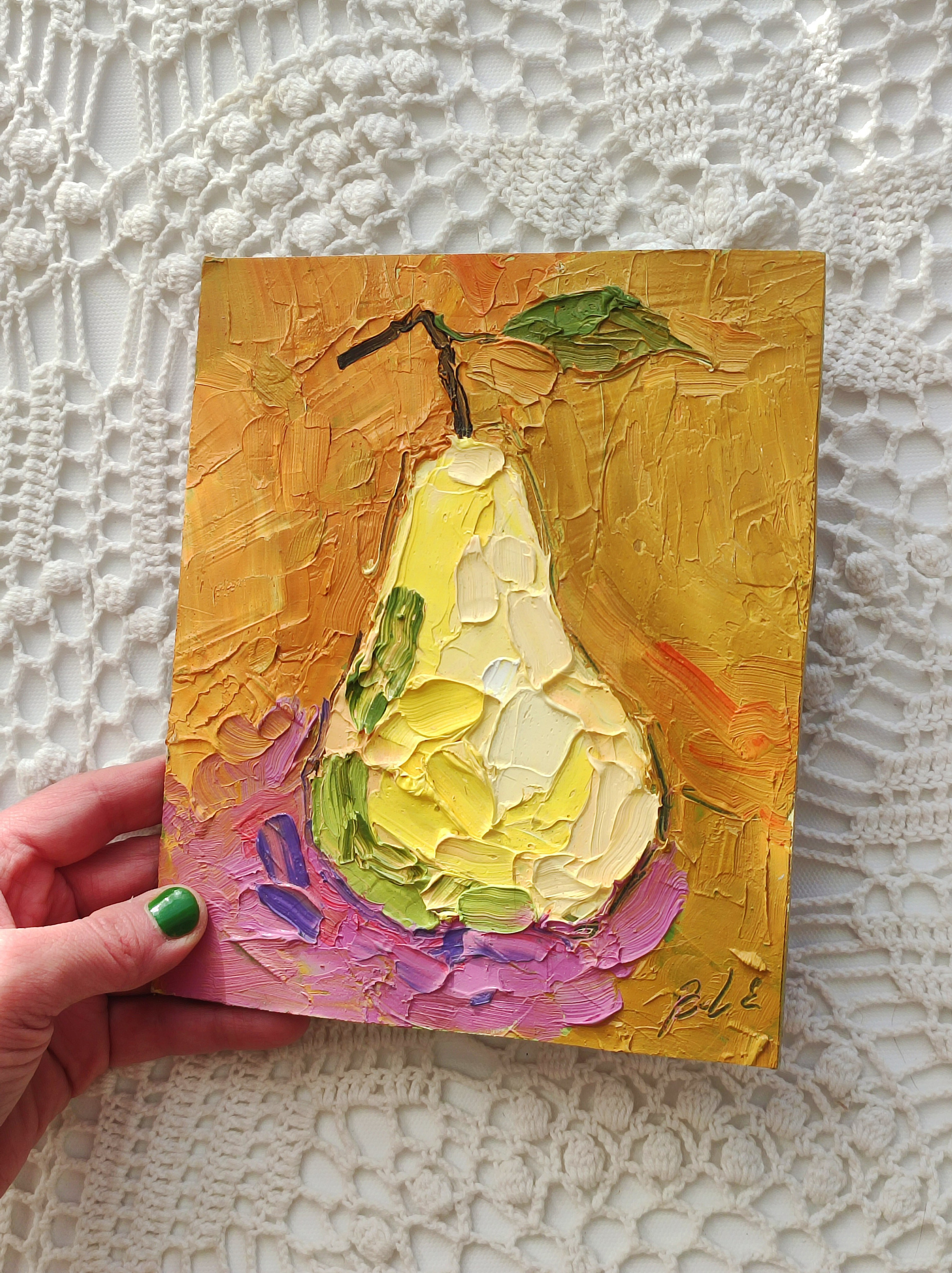 «Груша на оранжевом фоне». Масло, картон. 14,5×18 см. Прекрасный небольшой натюрморт маслом в пастозной технике мастихином. Рама для примера. Оформление обсуждаемо.