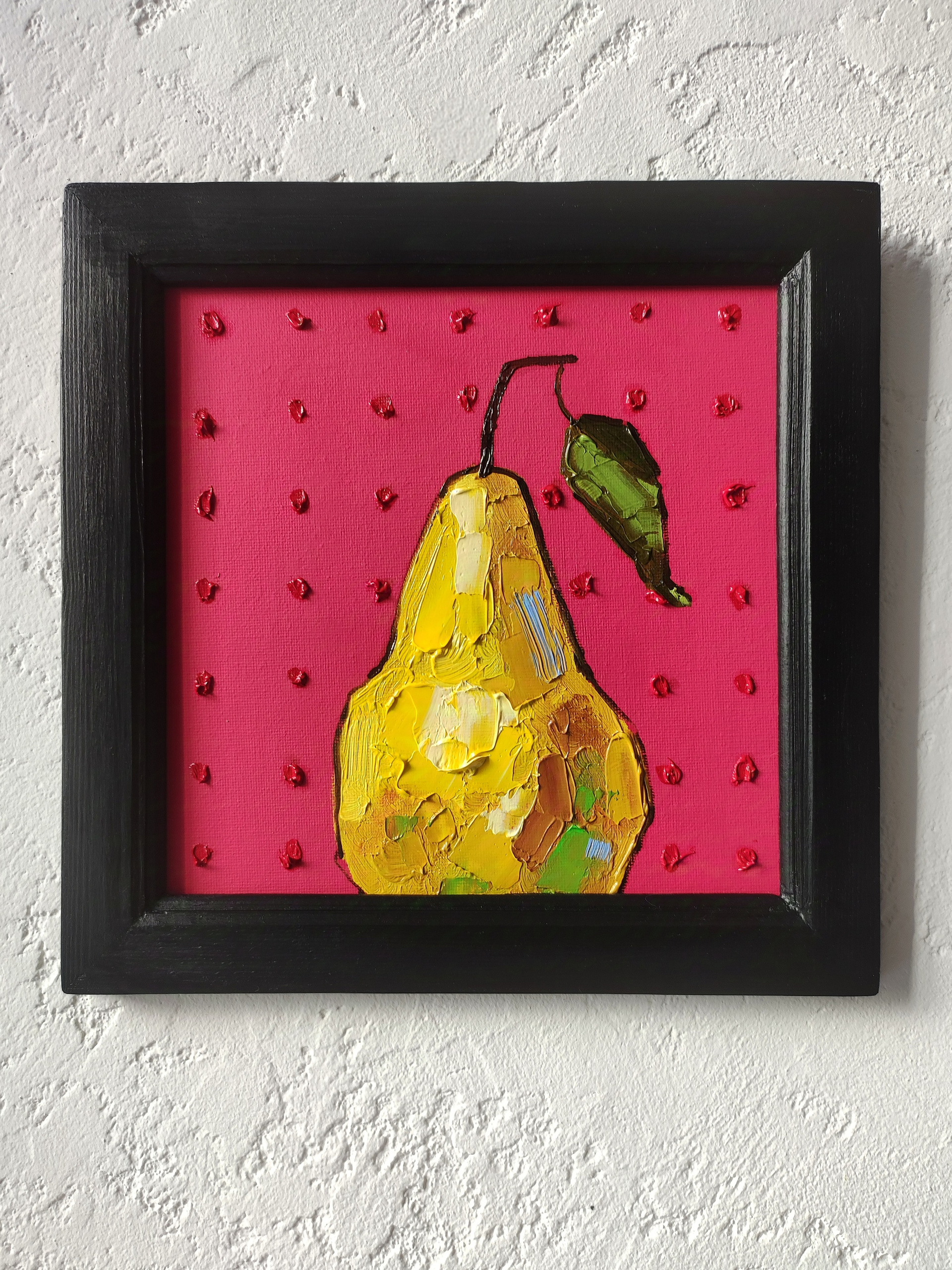«Грушенька на малиновом фоне». Масло, акрил, холст на картоне. 25×25 см. Рама для примера, оформление обсуждаемо.