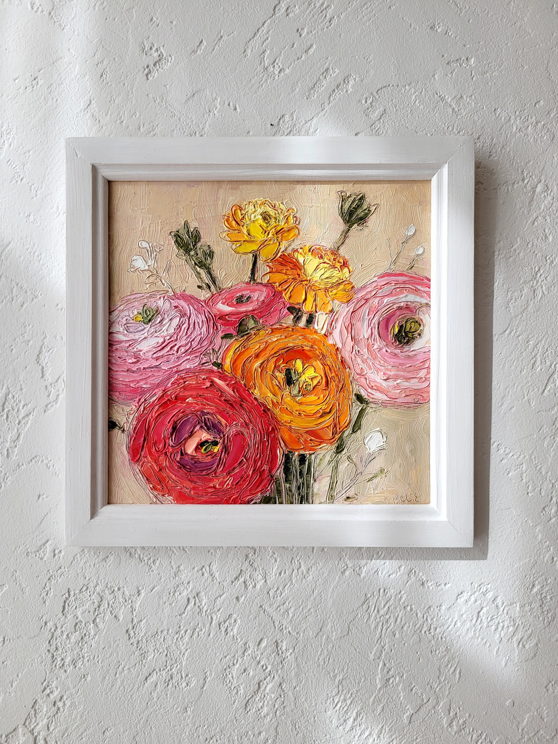«Ранункулюсы». Масло, холст на картоне. 25×25 см. Рама для примера.