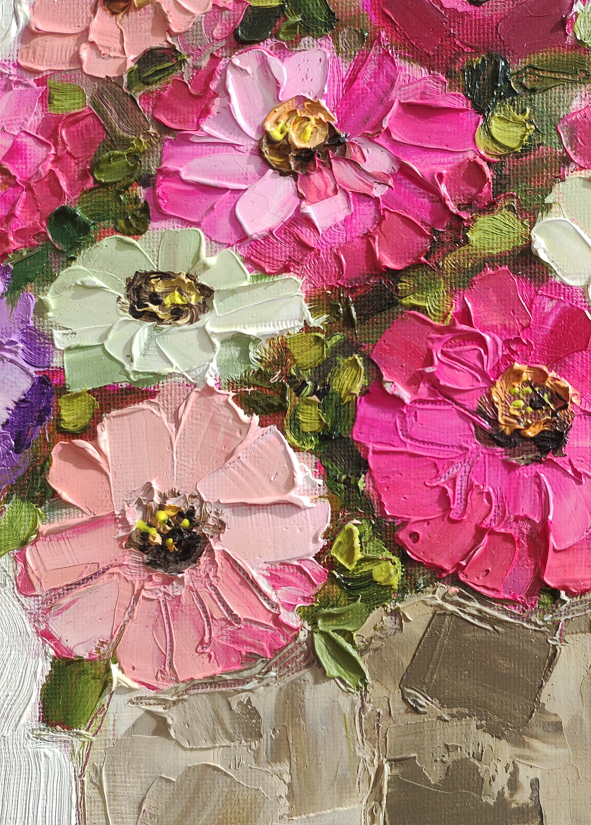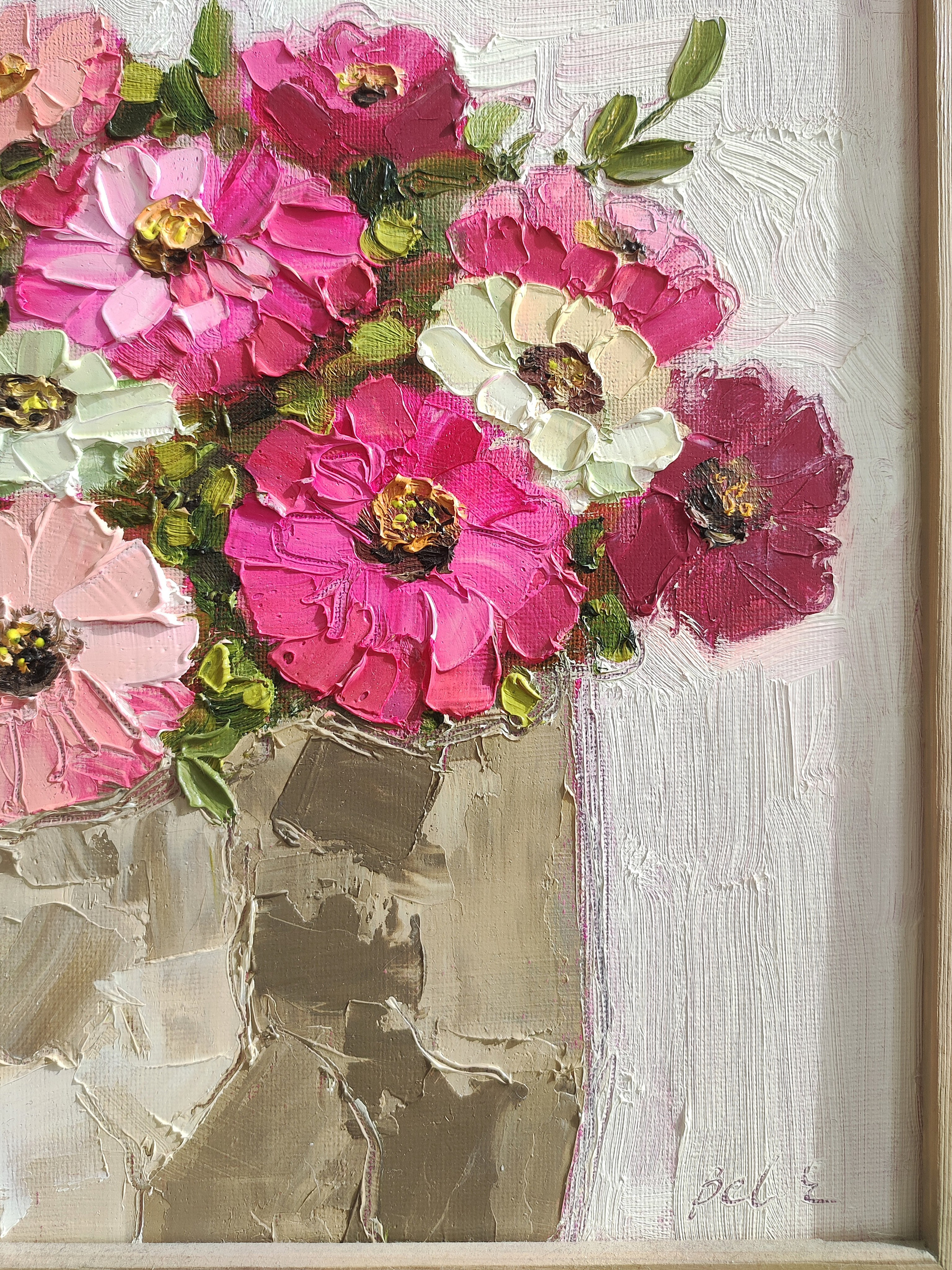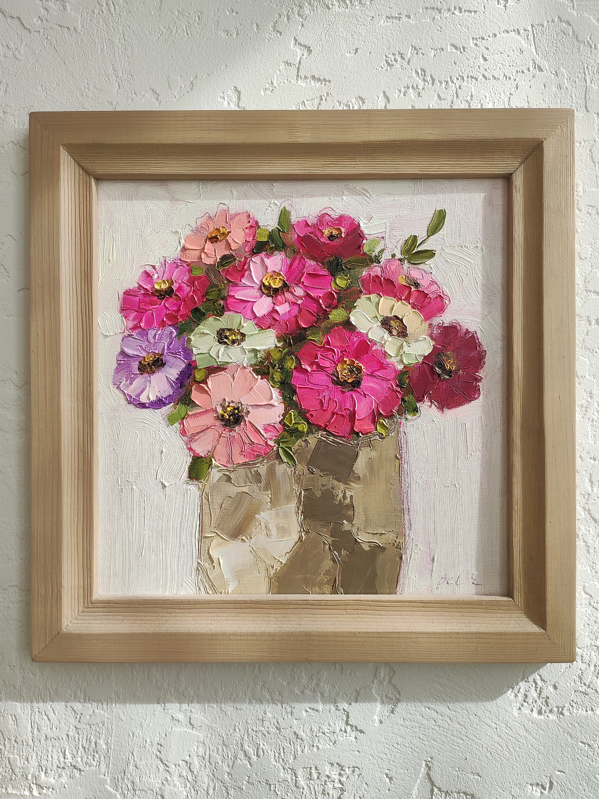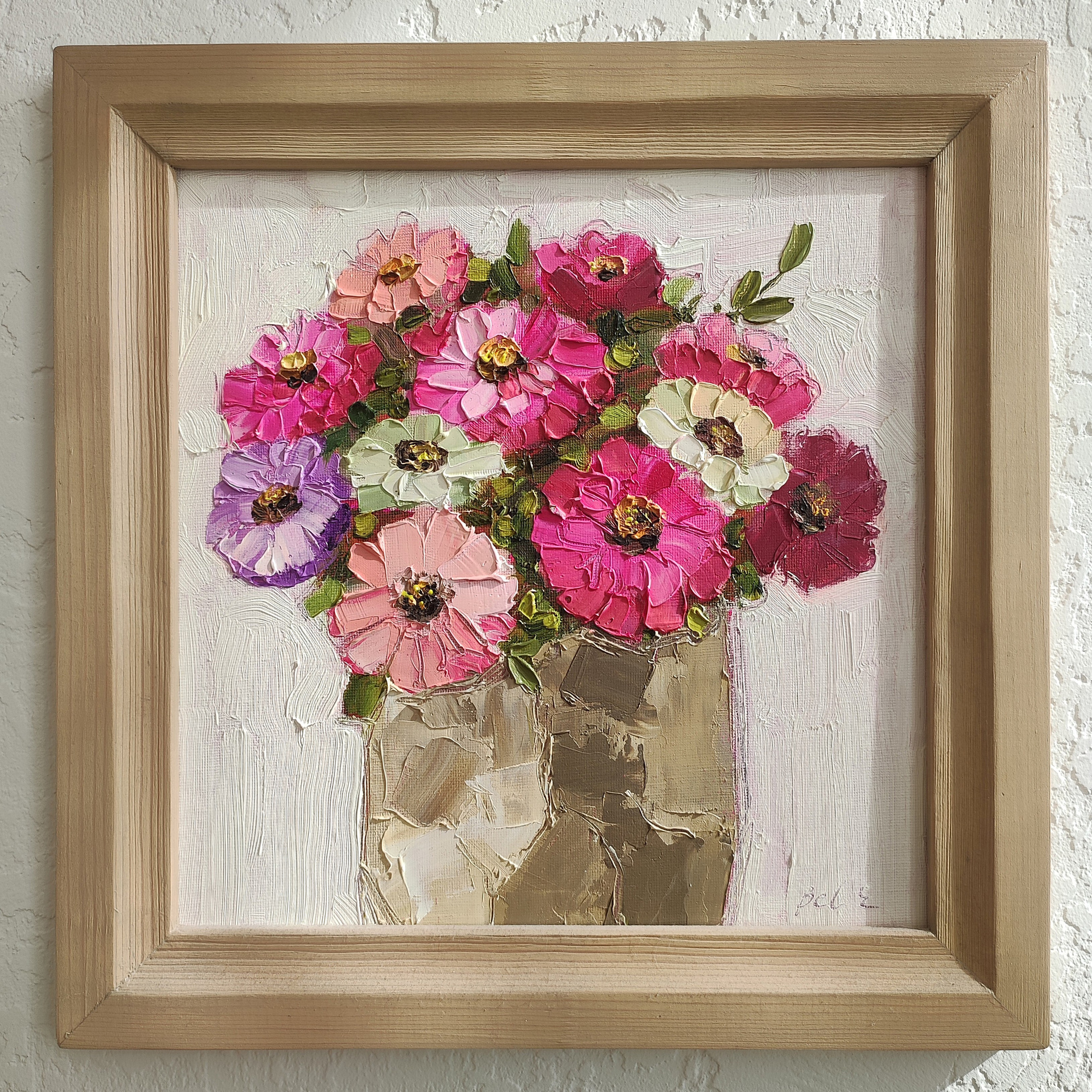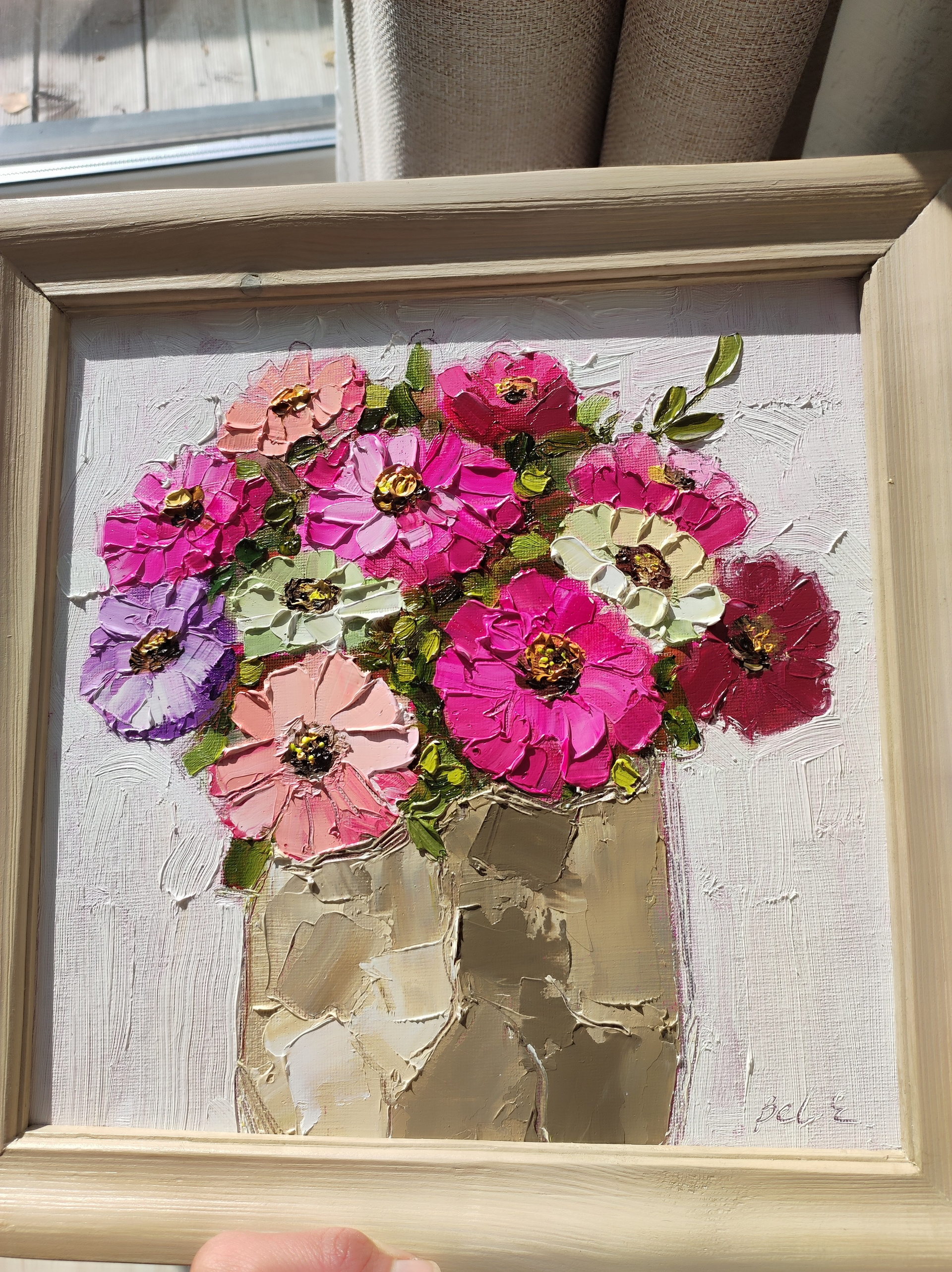 «Цветы в бумажном пакете». Масло, холст на картоне. Размер 25×25 см (без учета рамы) Продается в рамке из сосны. Возможна продажа без рамы и с рамой другого дизайна.