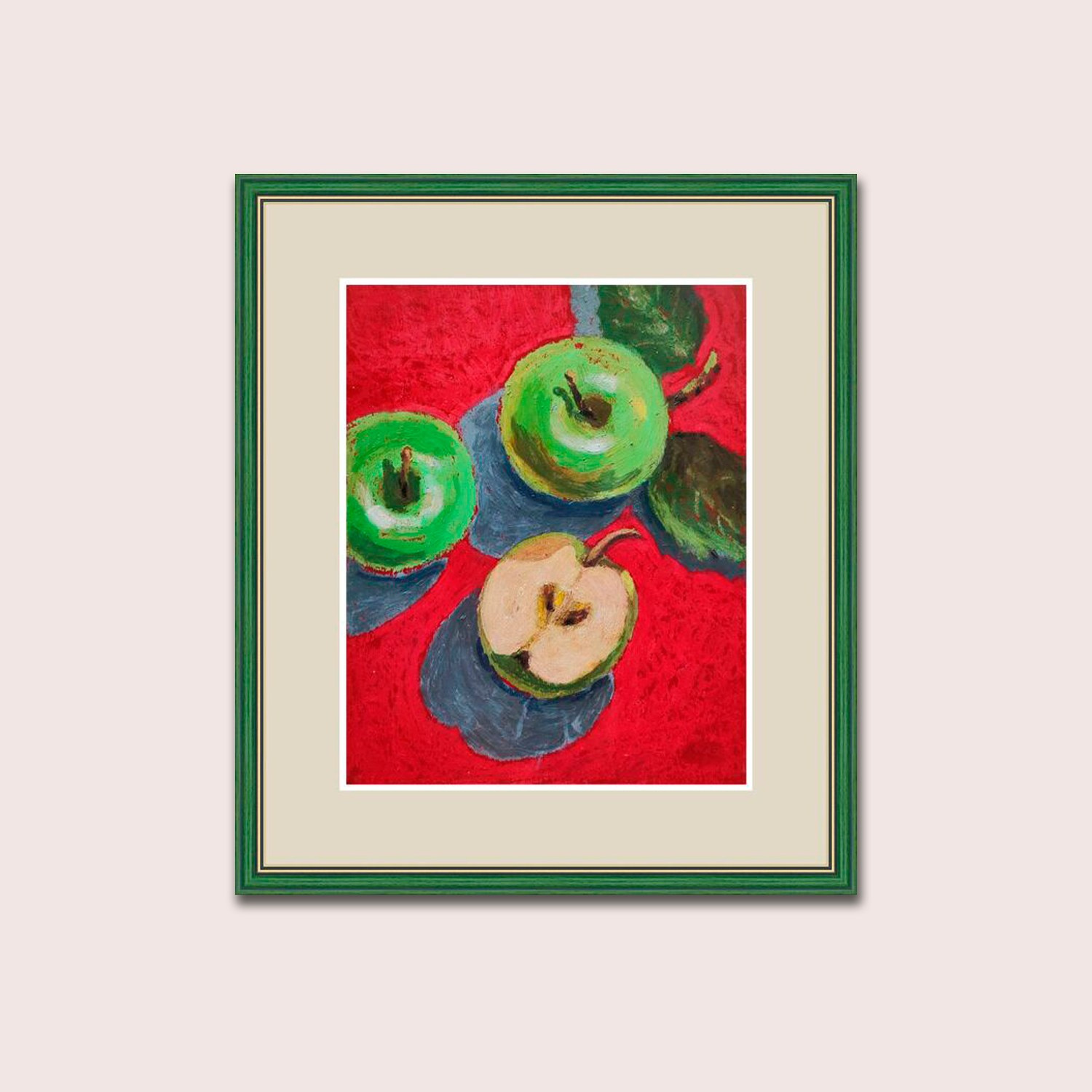 Яркий натюрморт с зелеными яблоками. Масляная пастель под лаком. Размер 20×25 см. Без рамы.