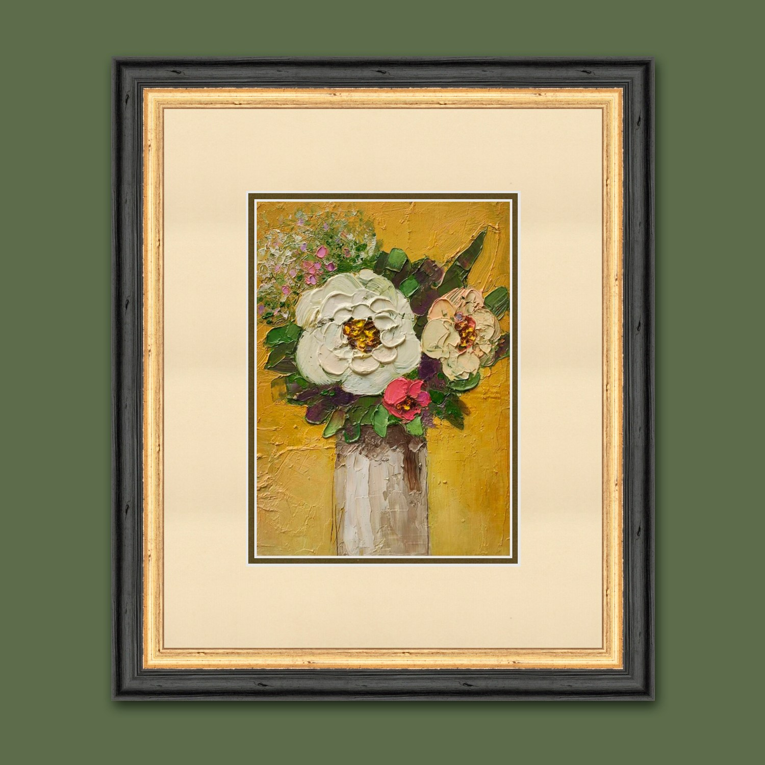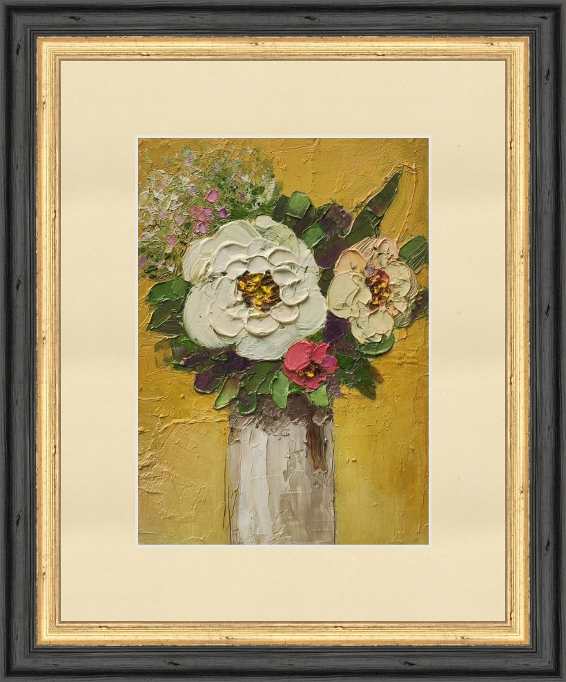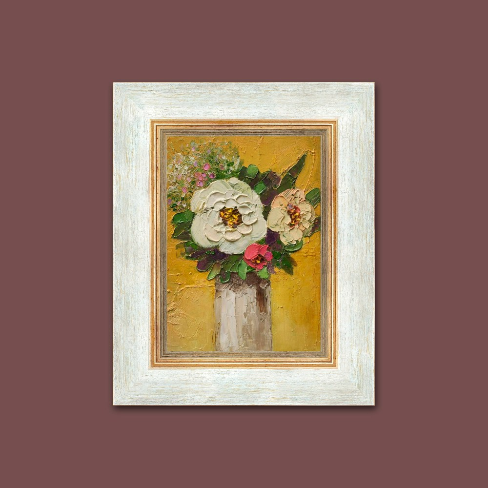 Картина с букетом цветов. «Знак внимания». Масло, картон. Размер 15,5×21 см. Продажа без рамы. Оформление в раму индивидуально под заказ. На фото оформление для примера.